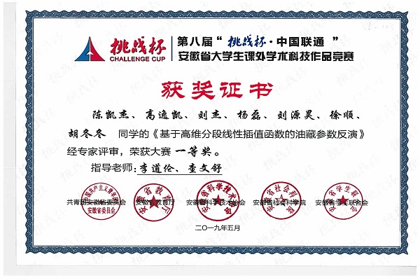 5月25日-27日,由共青团安徽省委员会、安徽省教育厅、安徽省科学技术协会等单位共同主办,我校承办的第八届“挑战杯·中国联通”安徽省大学生课外学术科技作品竞赛在翡翠湖校区成功举行。永利官网由李道伦、查文舒两位老师指导,陈凯杰(2015级)、高逸凯(2016级)、刘杰(2016级)、杨磊(2017级)、刘源昊(2017级)、徐顺(2015级)和胡冬冬(2015级)7位本科生的作品《基于高维分段线性插值函数的油藏参数反演》(自然科学类学术论文类)荣获一等奖,这是永利官网师生首次组队参加该项赛事,同时也实现了一等奖的历史性突破。