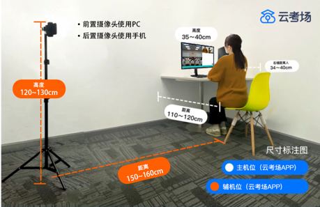 考生须准备主副两台具有摄像功能的设备,并在复试场所选择墙角位置,参照下图摆放座位。主设备为电脑,下载腾讯会议平台,摆放于考生正面;副设备为手机,安装钉钉,摆放于考生侧后方,与考生后背面约成 45°角,能够全程拍摄考生本人和电脑屏幕,复试全程开启。另准备一部电话,用于应急联系。
