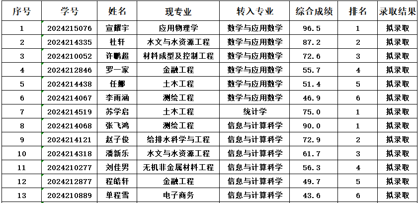根据《304永利登录入口普通全日制本科生转专业管理暂行办法》(合工大政发〔2024〕70号)(以下简称《暂行办法》),经学院组织的笔试和面试考核,按考核总成绩高低进行排序,提出拟录取名单,其中,数学与应用数学6人、统计学1人、信息与计算科学6人。现对拟录取名单予以公示。