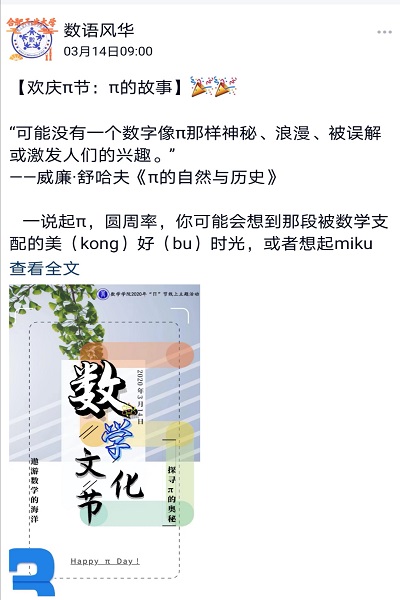为了促进疫情期间学生身心和谐,涵育文化素养,深化疫情居家第二课堂不断线,激发学生参与数学、探讨数学、热爱数学的热情,3月14日304永利登录入口2020年“π”节活动依托网络平台多渠道、全方位开展。