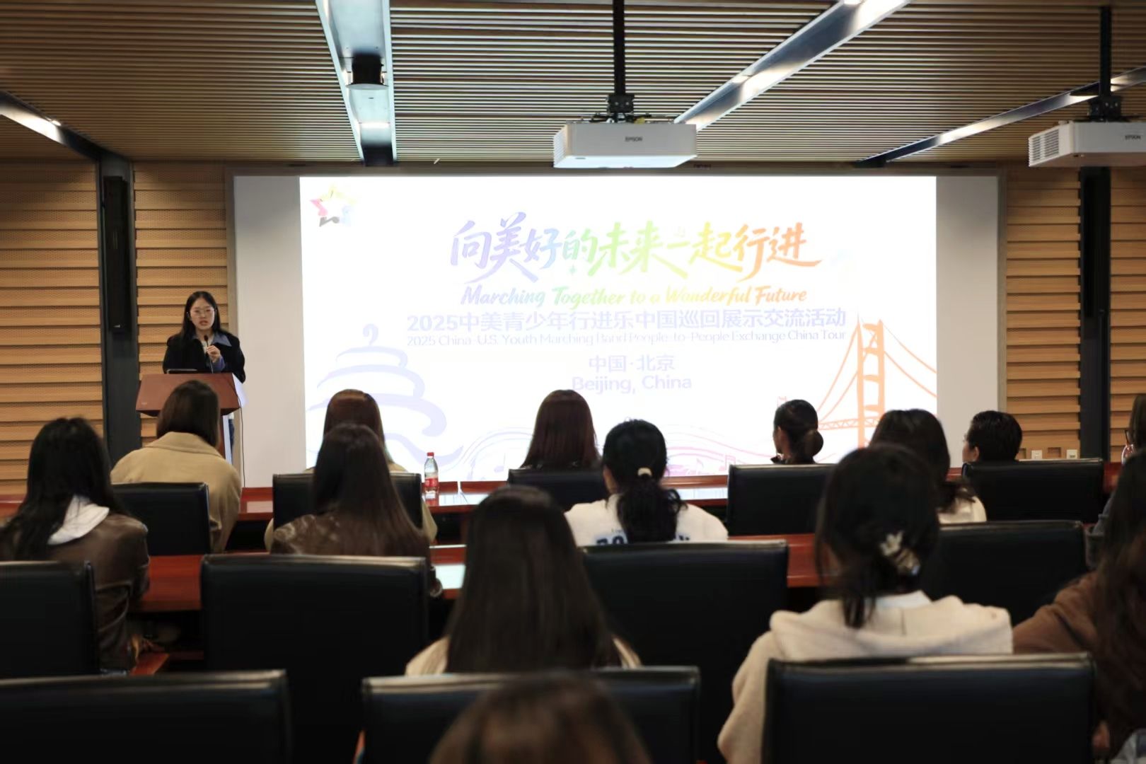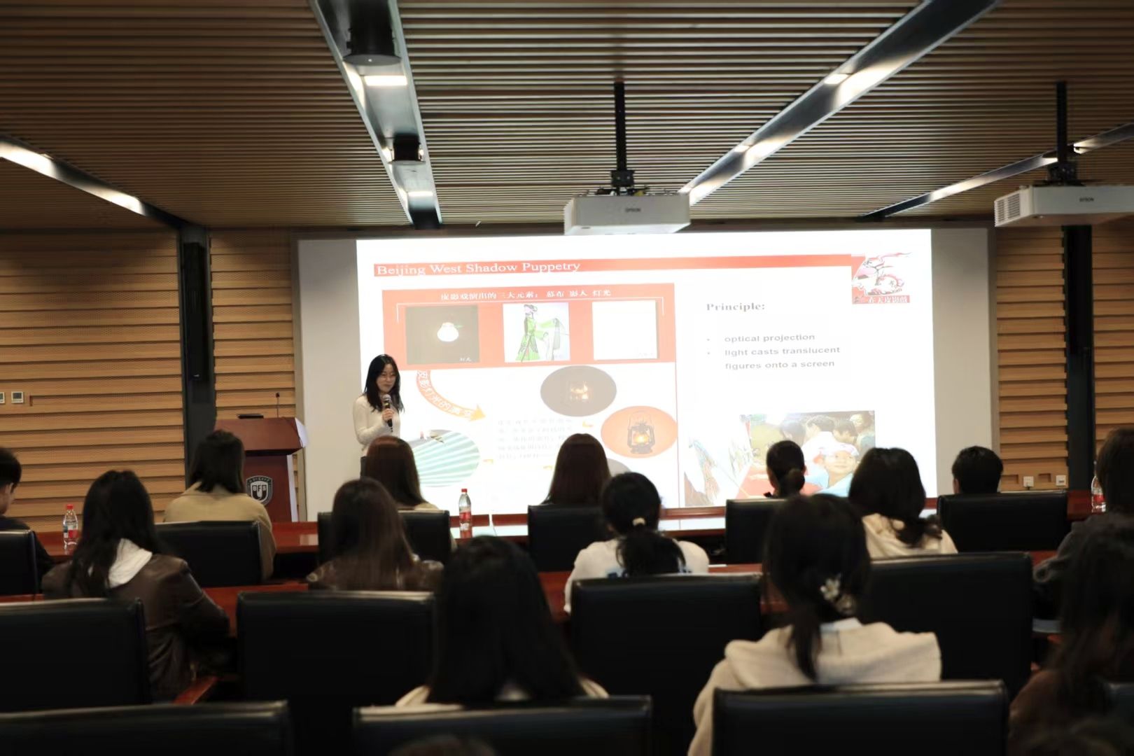 活动伊始,主持人屈慧茹用英语致辞,向远道而来的美国师生表示热烈欢迎,并介绍了皮影戏作为中国非物质文化遗产的历史价值与现实意义。随后韩子萌同学以流利的英文讲解了皮影的历史渊源与制作工艺,从选皮、雕刻到染色、定型,细致展现了皮影从原材料到艺术品的蜕变过程,彰显了学生党员在文化传播中的专业素养与使命担当。
