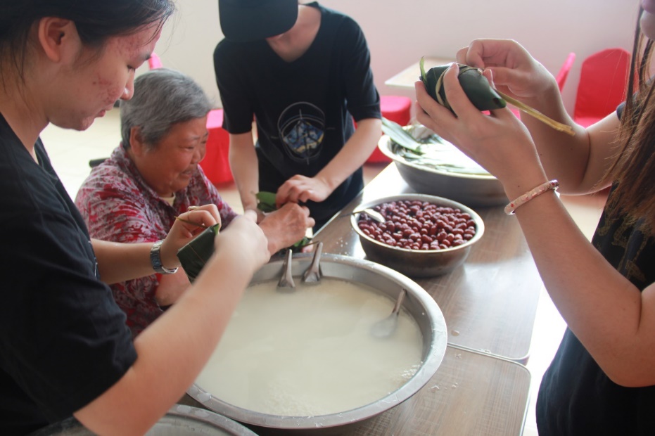 ——十一点左右,学生党员们又一同奔赴食堂,和老人们一起包粽子共度端午。一位老奶奶虽然腿脚不便坐着轮椅,但还是主动提出去食堂教大家包粽子,奶奶娴熟的手法精湛的技艺让大家感叹不已,都认认真真地跟着奶奶一步一步地学起了包粽子。粽子虽小,但小小的粽子里包的却是大家真诚的爱。