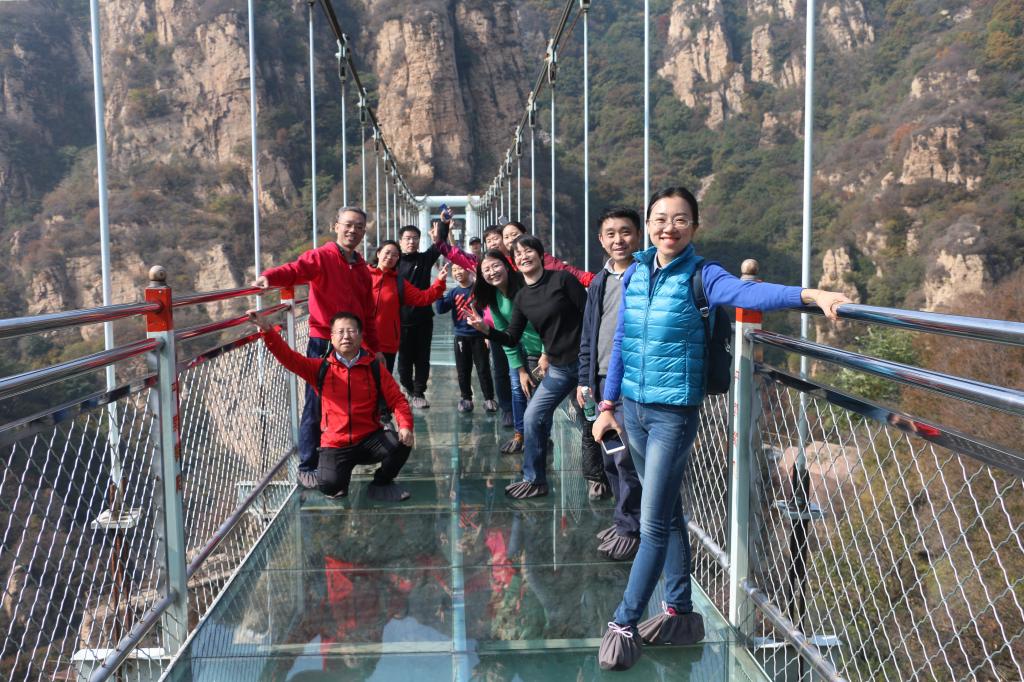 十月初,正值秋高气爽出游的好时间。活动当天,伴随着欢歌笑语,参加活动的老师们9点半便抵达了景区。大家在景区门口合影后开始了当日的郊游。有部分老师选择徒步登山,也有携带小朋友的教职工们选择了一侧的缆车。景区内共有两段玻璃栈道,一条玻璃桥与观景台。老师们漫步在山林间,悬崖峭壁上,低头俯瞰秀丽丛林,左右顾盼山峦起伏。两组队伍后来在悬空玻璃吊桥处相逢。
