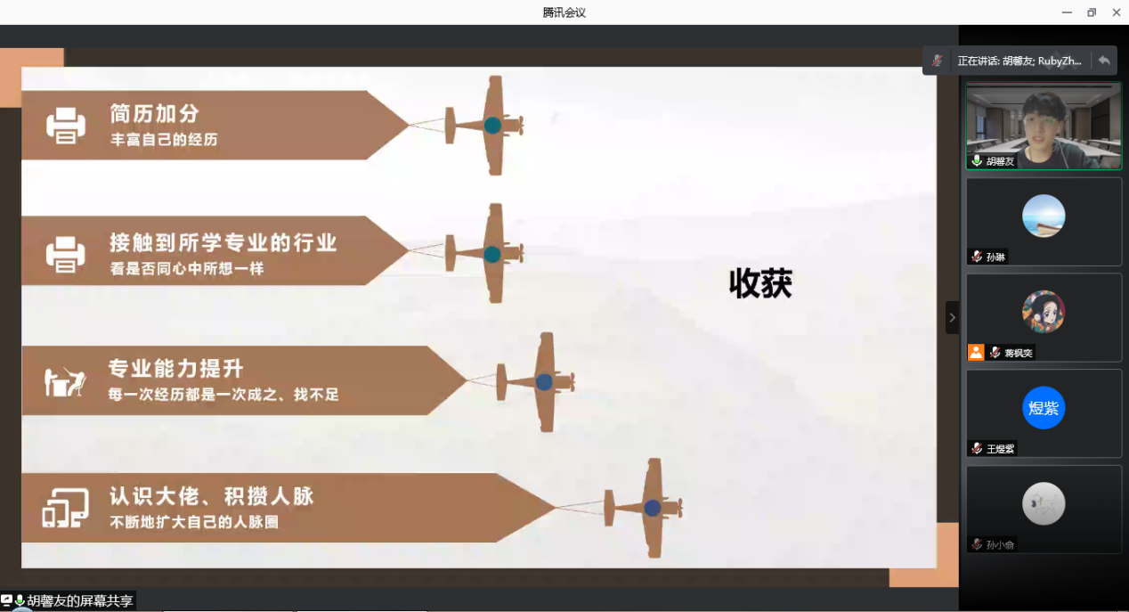 分享会第三部分由2015级胡馨友同志主讲。胡馨友同志在校期间曾担任taptap点点体育本科生党支部书记,目前就职于策马翻译集团,担任中华口笔译大赛办公室主任,北外灯塔计划生涯成长导师。胡馨友同志从自己的工作经历出发,针对同学们在工作就业实习方面的问题进行了答疑与分享,鼓励学弟学妹们多尝试新事物,找到自己的方向,在大学四年里创造属于自己的精彩。