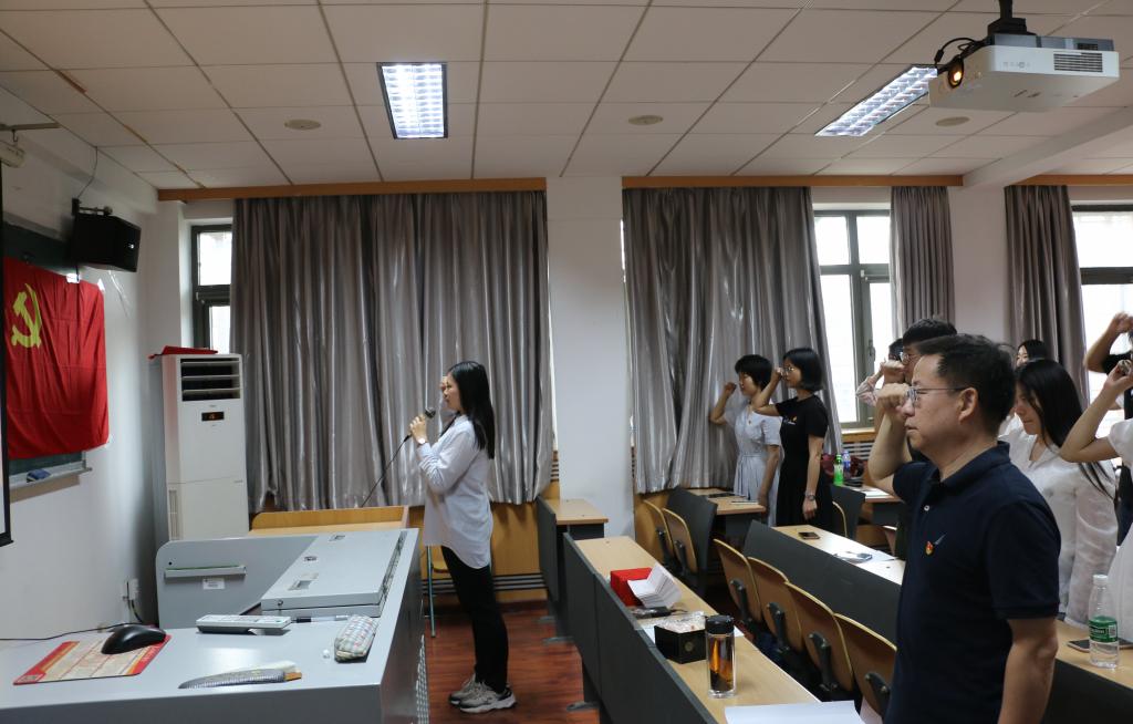 紧接着,在孙琳同志的带领下,全体新党员面向党旗进行了入党宣誓。随后本科生低年级党支部袁润同志作新发展党员代表发言。她提到:在党旗下宣誓,意味着我们的身份不仅是青年群众和北外学子,更是肩负重任的中共预备党员。今后,我们需要做到敢为人先,不畏艰险,投身实践,甘于奉献,不断反思,勇于开展批评与自我批评。牢记新时代党员的责任,接好支部传承与发展的接力棒,用奉献书写责任,用实干书写担当。最后,全体参会人员起立,奏唱国际歌,本次活动圆满结束。