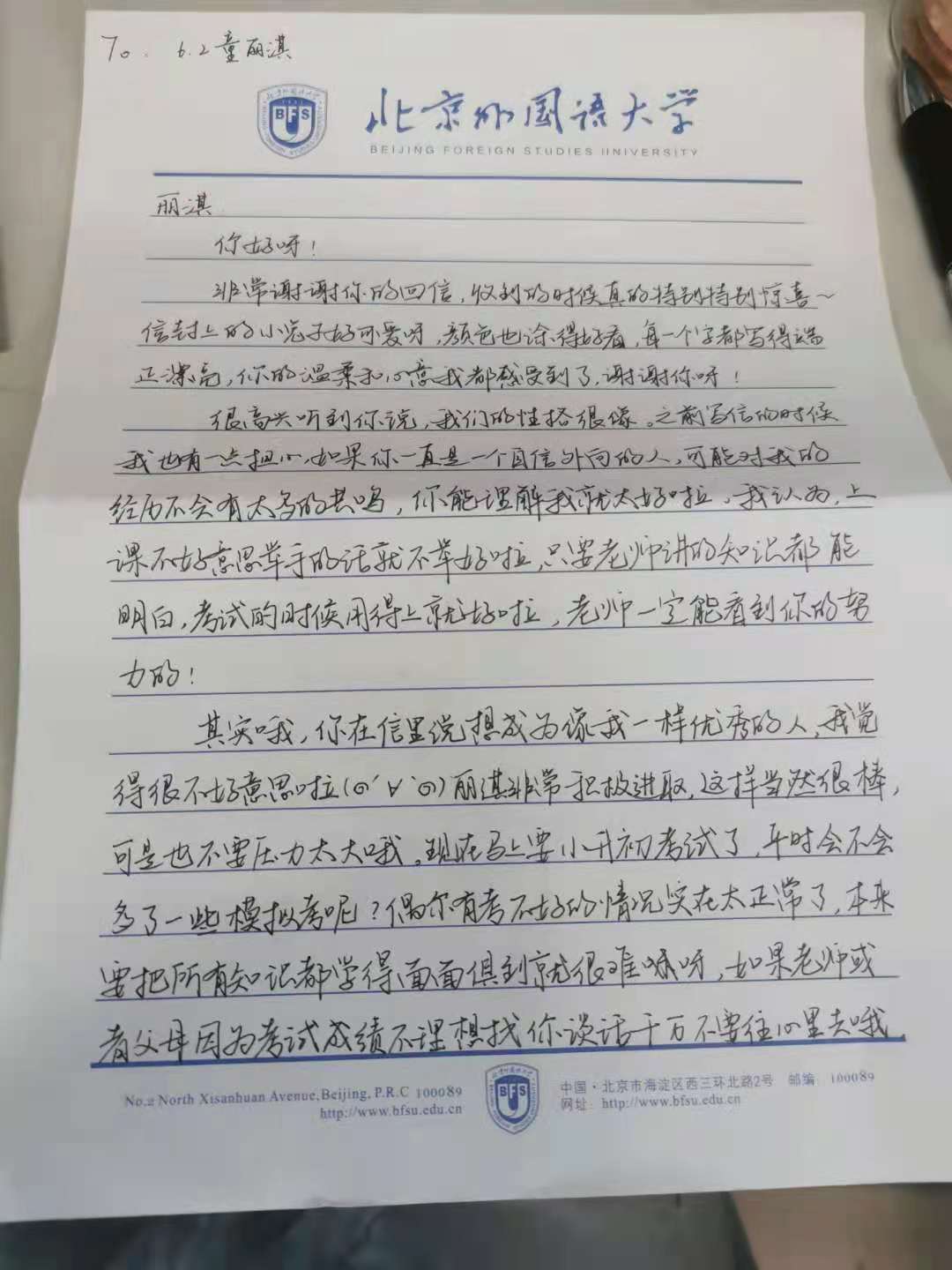 taptap点点体育本科生低年级党支部积极分子何蓉同志表示,自己非常开心能通过这次的活动认识可爱的丽淇小朋友。收到回信的时候真的很感动,因为没有想到一个六年级的孩子可以写出这样满满都是真诚的信,甚至还自己画了可爱的小信封,还能看到橡皮擦的痕迹,可以想象花了多少心思。希望丽淇小朋友可以快乐地长大,做最好的自己。