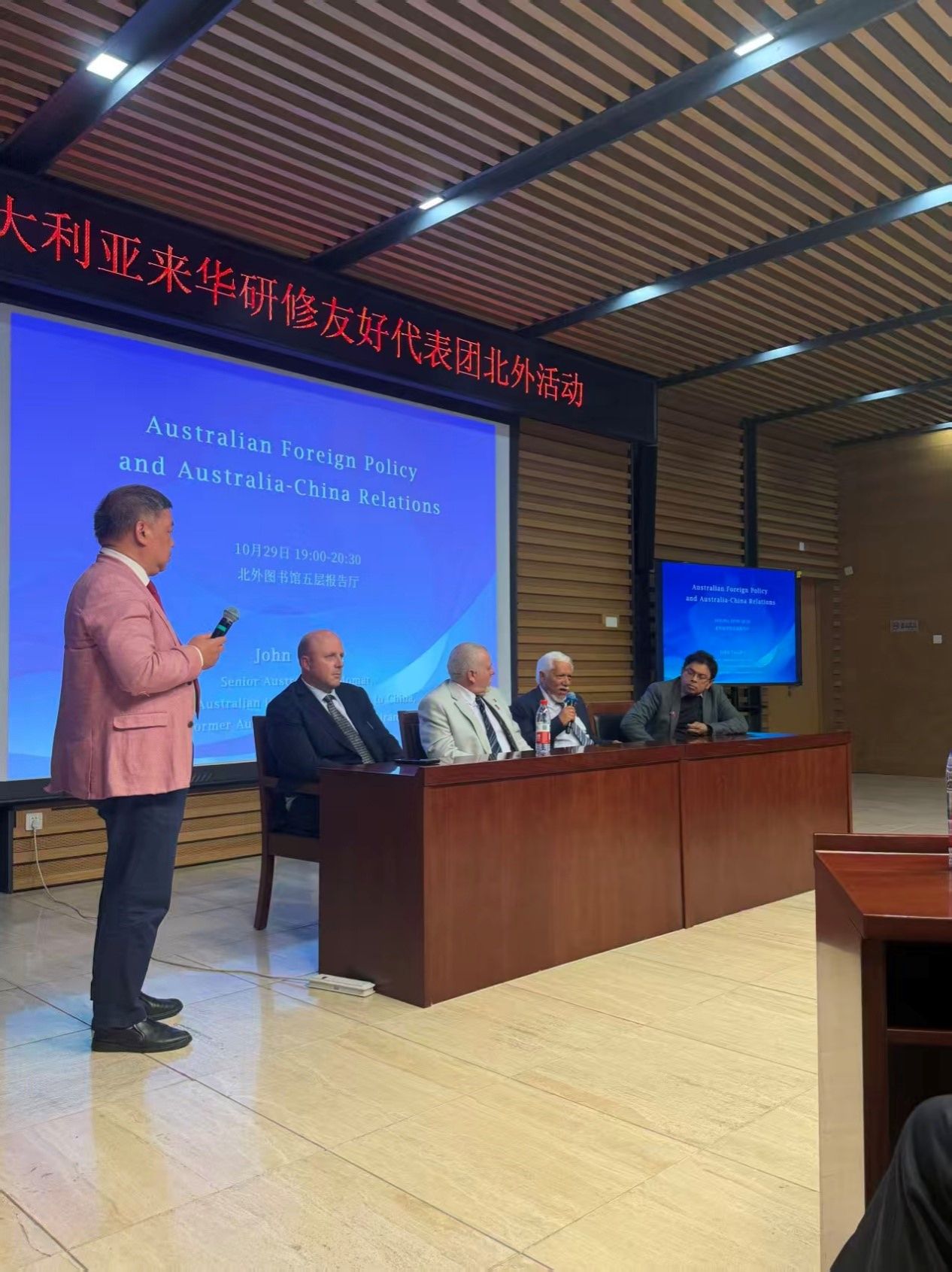 10月29日,澳大利亚来华研修友好代表团北外活动在taptap点点体育图书馆5层学术报告厅举行。代表团团长、首任澳大利亚驻华副大使约翰·兰德(John Lander),代表团副团长、澳大利亚公民党主席罗伯特·巴威克(Robert Barwick),代表团联络人、澳中企业家俱乐部主席袁祖文太平绅士等12位代表团成员,以及北外师生代表出席活动,在热烈友好的氛围中探讨中澳关系、进行跨文化交流。