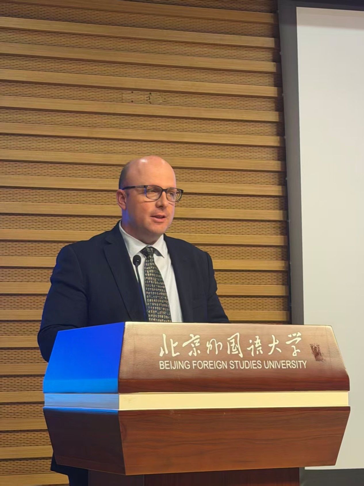 活动核心环节,两位代表团成员分享了精彩的讲座。第一位主讲人约翰·兰德以“澳大利亚外交政策和澳中关系”为主题的演讲。兰德曾在澳大利亚外交贸易部(DFAT)任职30年,出任过驻华使馆副馆长(副大使)、外交贸易部中国处处长。他指出,二战时期中澳就曾作为坚实的盟友共同抗击侵略,现在双方更是重要的贸易合作伙伴,近期澳大利亚领导人访华改善了双边关系。他呼吁澳大利亚采取更加独立的外交政策,主张澳大利亚退出AUKUS,正视中国的重要性,并走向更加独立与合作的外交道路。