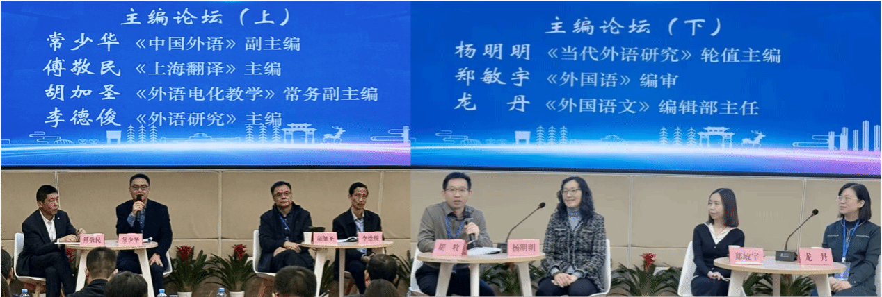 此次会议设有上、下两场主编论坛。《中国外语》副主编常少华、《上海翻译》主编傅敬民、《外语电化教学》常务副主编胡加圣、《外语研究》主编李德俊、《当代外语研究》轮值主编杨明明、《外国语》编审郑敏宇、《外国语文》副主编龙丹聚焦社会翻译学的最新研究动向,并结合各刊的办刊宗旨、栏目建设与选题取向介绍了重点关注的前沿热点和研究方向。论坛现场座无虚席,交流充分、气氛热烈。