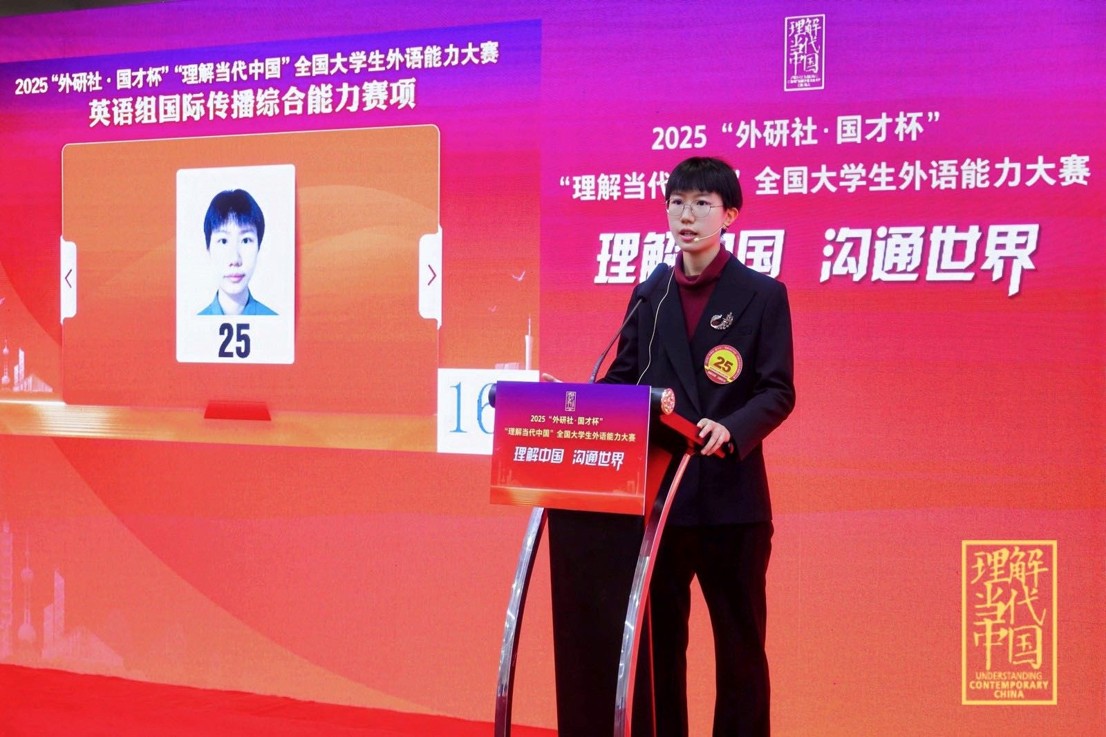 外研社 国才杯”“理解当代中国全国大学生外语能力大赛英语组国际传播综合能力赛项全国金奖:2025级(外交外事高级翻译)本科生李湉宇。