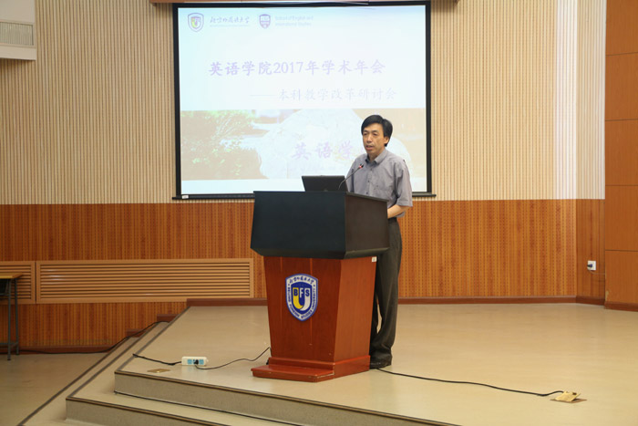 ——副校长孙有中教授做了主题为“论跨文化思辨英语人文教育”的重要发言。他指出,英语教育中的知识学习应该与语言学习融合,而不是先语言、后知识。随着形势的变化和生源质量的提高,人文素养和思辨能力的培养已经成为英语教育的主流。英语专业学生的质量不仅要体现在高超的语言能力上,还应表现在宽广的人文知识素养、敏锐的思辨能力、跨文化国际视野以及创新思维等方面。