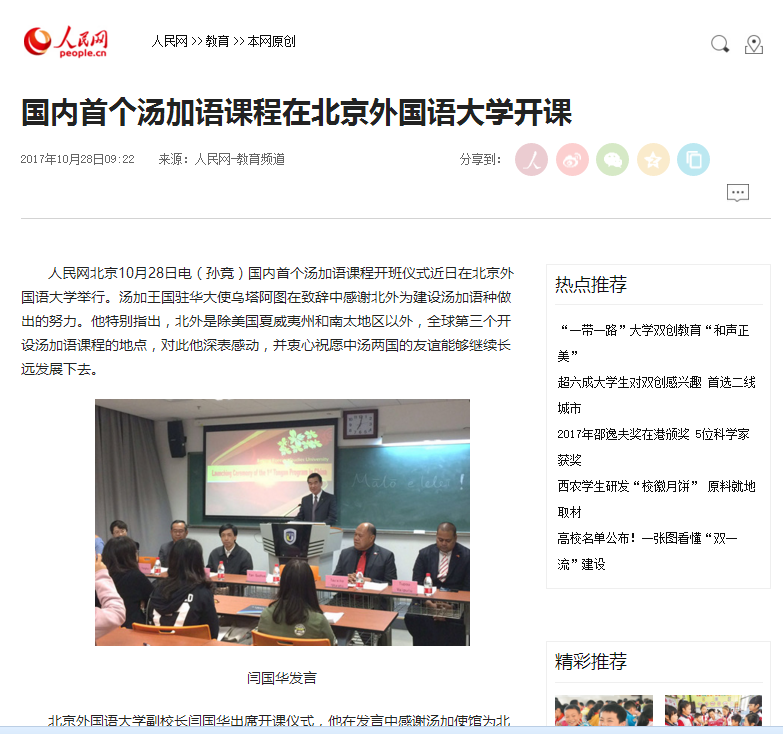 ——近日,国内外新闻媒体纷纷报道了我校开设国内首门汤加语课程的新闻。例如,10月27日,汤加王国最重要的新闻网站Matangi Tonga Online刊登了名为“Beijing Foreign Studies University Launches Tongan Language Program”的新闻,