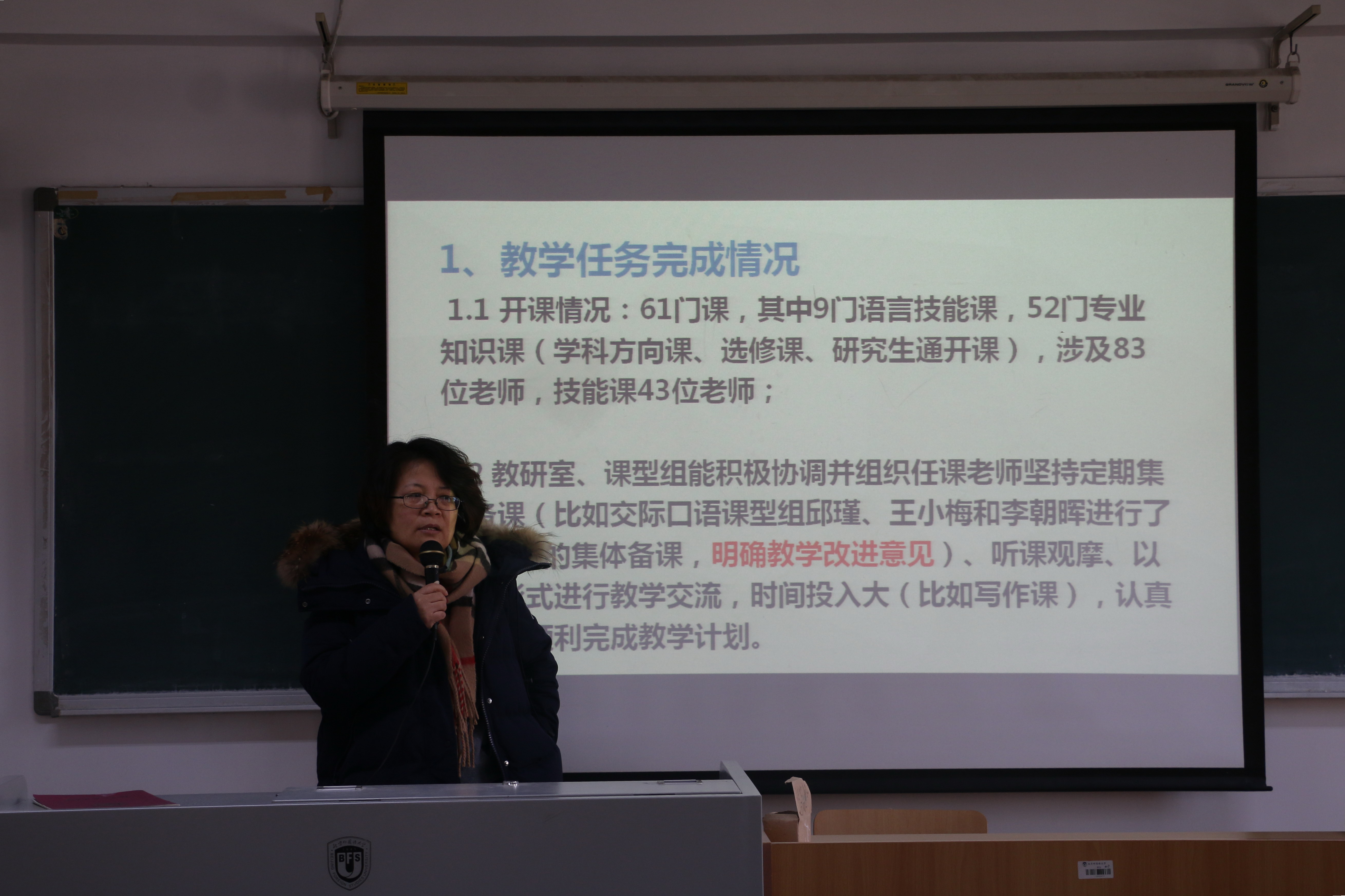 ——分管本科教学工作的副院长张莲教授就本科教学任务完成情况,教学研讨、管理与监控,迎接本科教学工作审核评估,写作、语音辅导中心建设及运行,第二轮学科方向课立项,本科教学改革立项审核,2018年本科教育教学改革专项申报,组织辅导参加第二届全国高等院校英语教师教学基本功大赛,本科常规管理工作,以及确定下学期开课计划等方面做了全面总结。