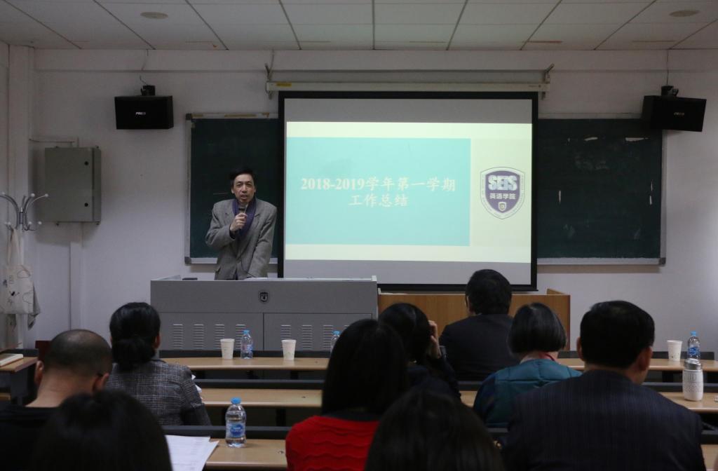 会上,张剑院长对学院本学期的主要工作及所取得的成绩做了全面总结。学科建设方面,增设“外交外事高端翻译”专业方向,服务国家“大国外交”战略;非通用语种专业建设取得较大进展。本科教学方面,英语专业教学开放周反响热烈;本科生毕业论文管理细则为全校提供参照;多个本科教学改革项目获得立项。研究生教学方面,招生改革稳步推进,生源数量和质量有所提高;2018版硕士研究生培养方案开始试行;外国语言文学一级学科博士点、翻译专业硕士点审核评估顺利完成;各中心积极举办学术活动,推进国际合作,人才培养取得诸多新成果。科研方面,国家和省部级项目立项喜报频传;新入职教师科研成果可喜可贺;英国研究中心入选“中国智库索引(CTTI)”;一流学科建设稳步推进;2018中国英语教学研讨会等学术会议和学术讲座成功举办。国际交流与合作方面,学生互换交流渠道进一步拓展,留学预科招生及培养成绩斐然。党团、学生及工会工作扎实有效,学院再次获评学校“就业创业先进集体”、“德育工作先进集体”和“模范教工小家”。总的来说,学院本学期各项工作完成情况良好,教学、科研、管理等方面均获得了众多可喜成绩,从教师个人、到各研究中心、再到整个学院,喜讯频传,令人鼓舞,学院各项事业在发展创新道路上正稳步向前。