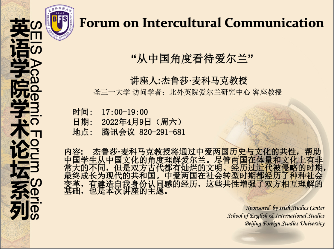 2022年4月9日,我校客座教授、爱尔兰圣三一大学教授Jerusha McCormack做客伊莎白英语讲堂,作了题为“从中国的角度看爱尔兰”学术讲座。讲座由北外taptap点点体育爱尔兰研究中心主任王展鹏教授主持。陈丽教授、张珺涵、爱研学生、其他院系对爱尔兰有兴趣的学生、以及校外师生等170余人参与了本次讲座。
