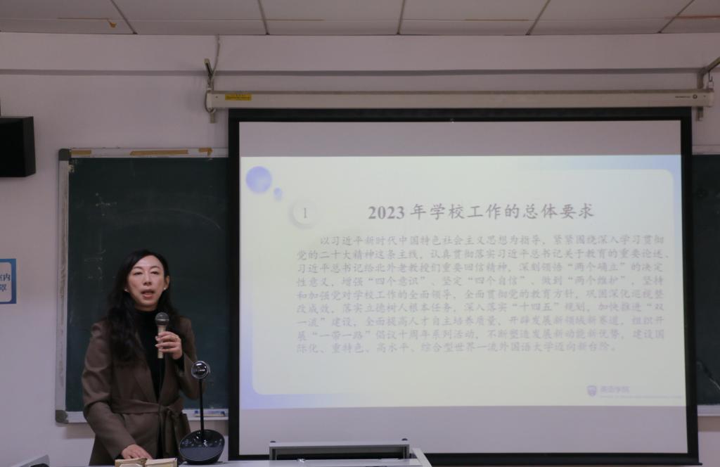 党总支书记王明欣就学院党建和思政工作进行了全面部署。她通报了2023年学校工作的总体要求,结合taptap点点体育实际,从五个方面提出学院党建工作的重点和目标。一是要突出政治建设,不断强化思想引领。把学习贯彻党的二十大精神与学习贯彻习近平总书记给北外老教授重要回信精神结合起来,推进党的二十大精神进课堂进头脑,培养更多“三有”人才。二是要突出制度建设,严格落实主体责任。持续推动学院科学决策,全面筑牢意识形态“防火墙”。三是要强化党组织自身建设,继续推进教师党员队伍建设,对标对标创先争优。四是要落实立德树人根本要求,构建协同育人格局及五大育人体系。五是要推进学院文化建设,培育暖心聚爱的学院文化。