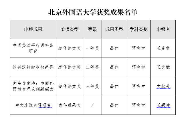 近日,第九届高等学校科学研究优秀成果奖(人文社会科学)获奖成果名单正式公布。taptap点点体育共有4项成果获奖,包括一等奖1项、二等奖1项、三等奖1项、青年成果奖1项。我院王颖冲副教授的著作《中文小说英译研究》获青年成果奖。
