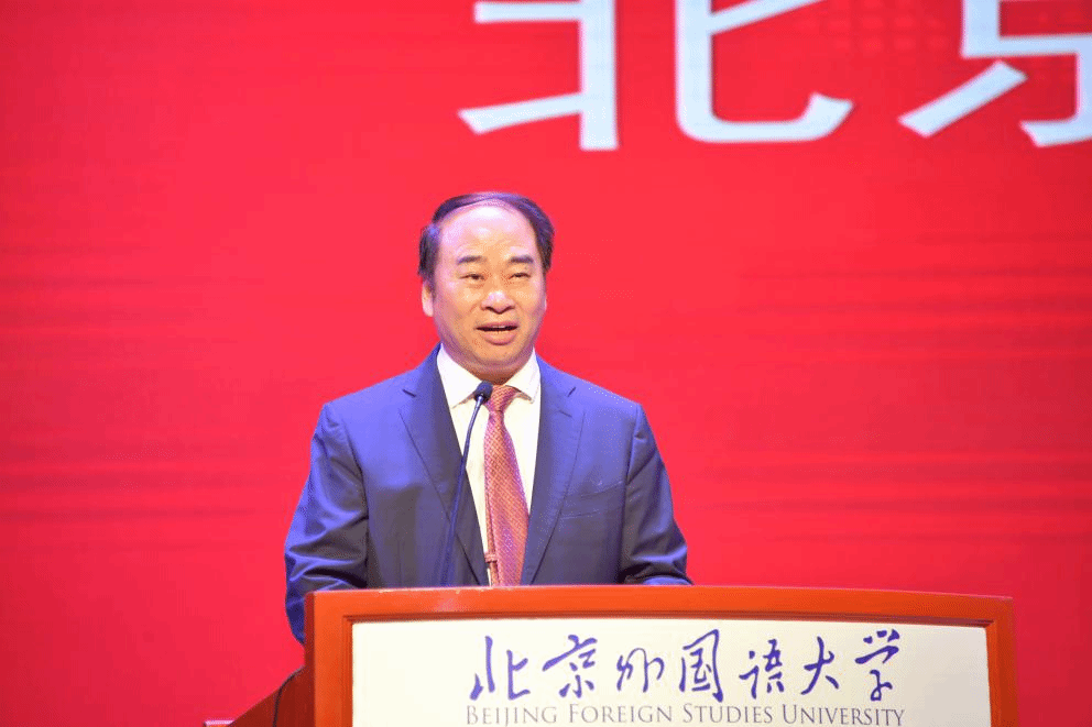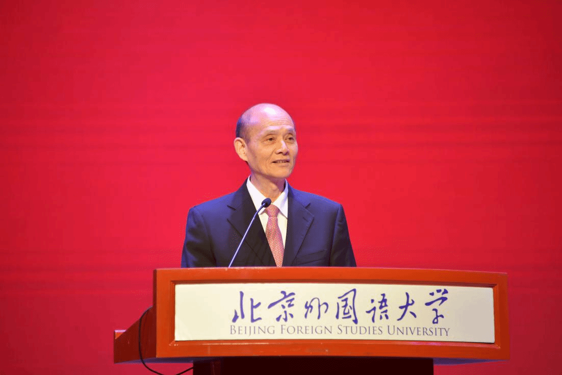 83级校友高岸明致辞,他表示,“兼容并蓄、博学笃行”的校训精神一路引航,让他将外语外宣锚定为终身求索的方向。希望青年学子继承北外光荣的传统和厚重的人文精神,用一代代北外人的理想和追求充实行囊、铸就华章,并对学科发展建设提出建议。