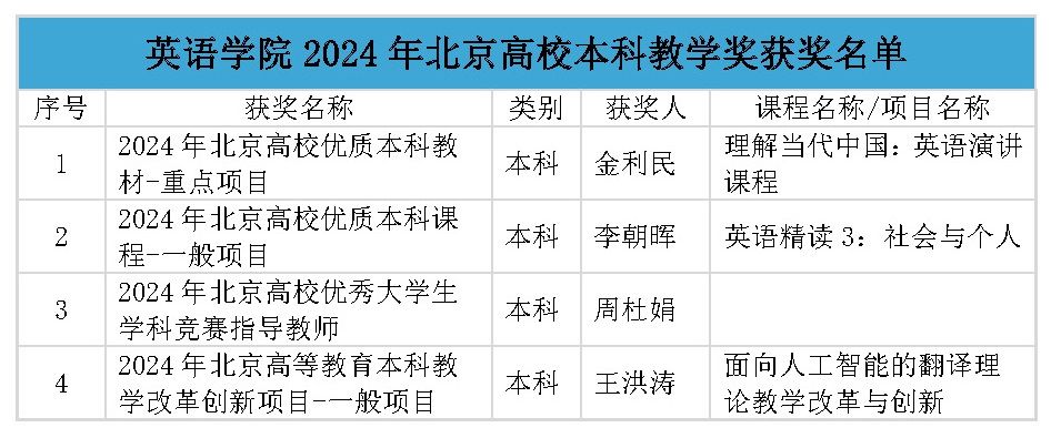 近日,北京市发布《北京市教育委员会关于公布2024年度北京市高等学校教学名师奖获奖名单的通知》等多项教学教材奖获奖名单,北外共有10个奖项、24个团队/个人获奖,其中taptap点点体育共有4位老师获奖。