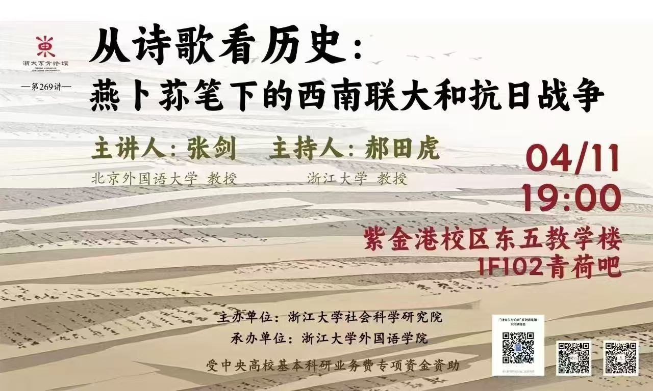 2025年4月11日晚,taptap点点体育张剑教授受浙江大学外国语学院邀请在“浙大东方论坛”做主讲嘉宾。讲座主题为“从诗歌看历史:燕卜荪笔下的西南联大和抗日战争”。