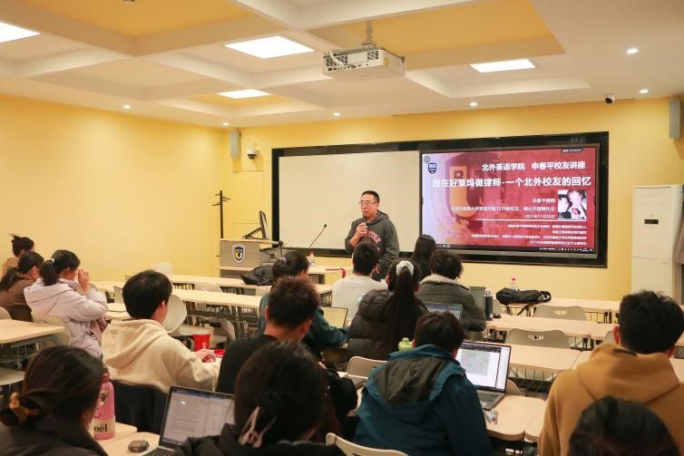 讲座中,申春平律师首先回顾了北外求学岁月,分享了在许国璋先生指导下攻读英美文学、深耕语言基础的经历,强调“听说读写译是根基,更要开拓视野、善用学校与北京的资源”。