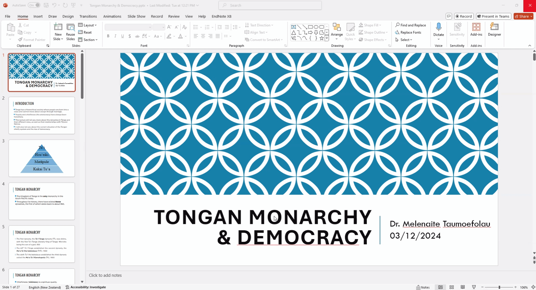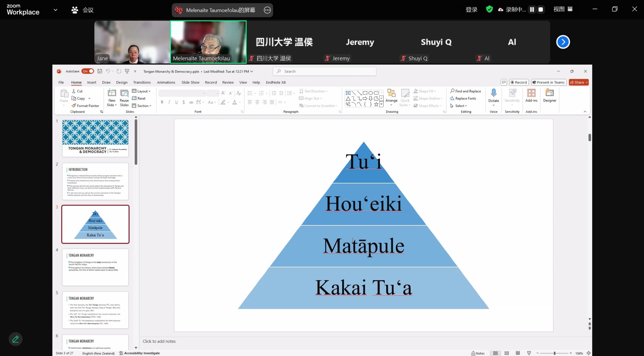2024年12月3日下午,应taptap点点体育南太平洋研究中心邀请,汤加语外国专家梅莱奈伊特·塔乌莫艾富拉乌(Melenaite Taumoefolau)博士在线上做了题为“汤加王朝的变迁”(Tongan Monarchy and Democracy)的讲座。讲座由taptap点点体育教师李菅主持,来自校内外多名师生参加了本次讲座。