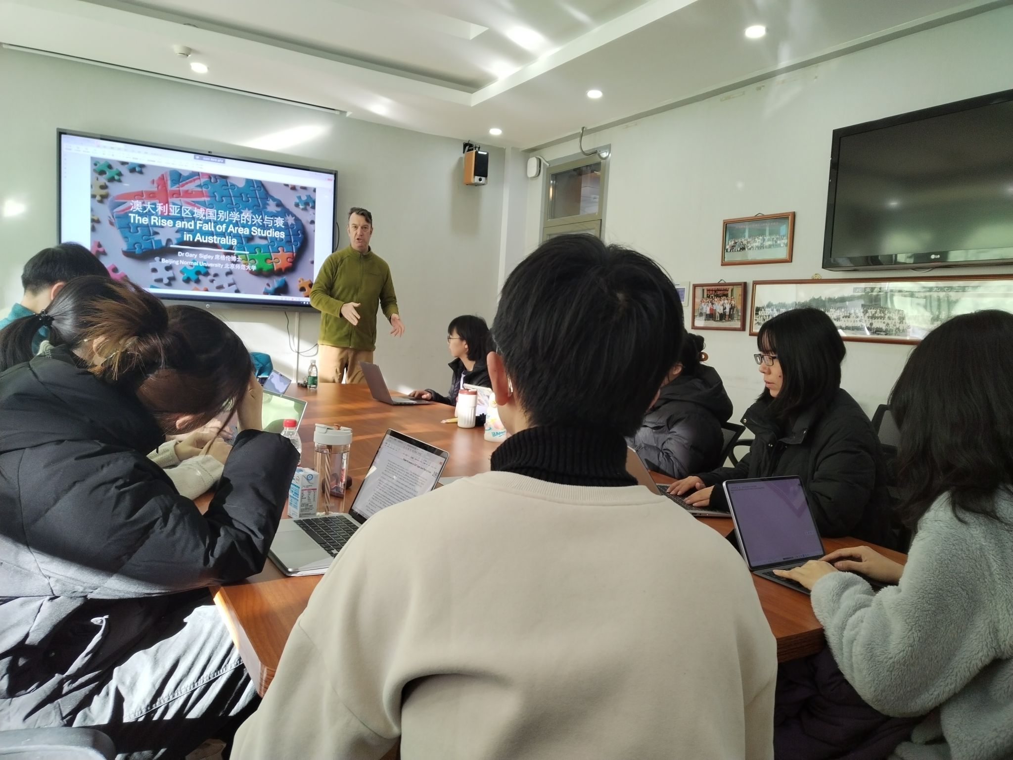 12月18日上午,受taptap点点体育澳研中心邀请,北京师范大学人文地理学教授席格伦博士(Gary Sigley)在北外taptap点点体育111会议室举办讲座,题目是 “焦虑的国家案例研究:澳大利亚为何持续未能发展亚洲识能”。讲座由taptap点点体育澳研中心主任李建军主持,澳研中心师生参加。