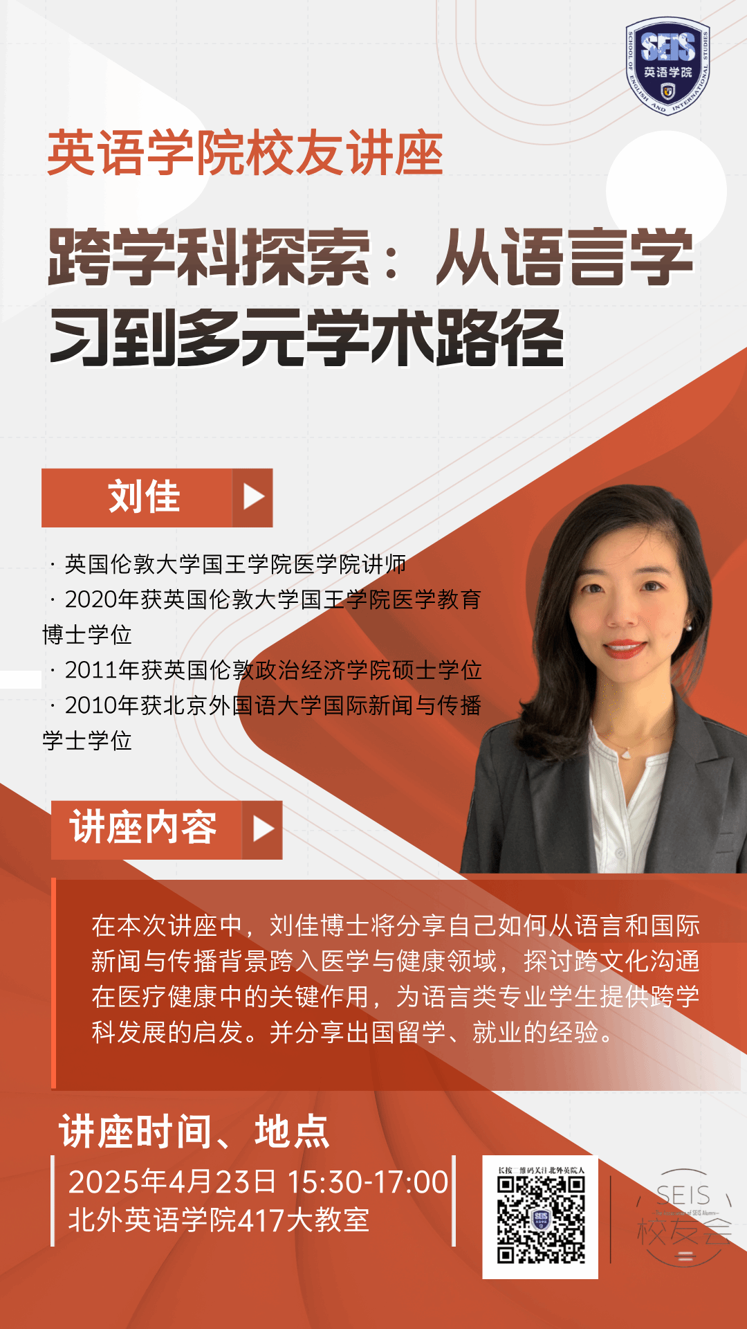 在本次讲座中,刘博士将分享自己如何从语言和国际新闻与传播背景跨入医学与健康领域,探讨跨文化沟通在医疗健康中的关键作用,为语言类专业学生提供跨学科发展的启发。并分享出国留学、就业的经验。