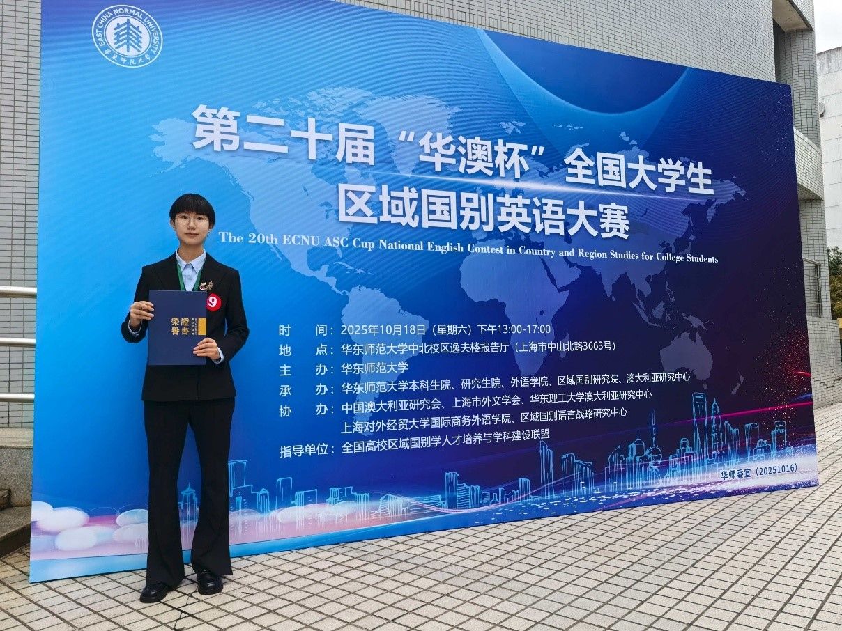 2025年10月18日,由华东师范大学外语学院主办,华东师范大学外语学院区域国别研究所、华东师范大学澳大利亚研究中心承办,上海市外文学会、上海外语教育出版社等单位协办的《中国日报》“华澳杯”第二十届全国大学生区域国别演讲与知识大赛圆满落幕。经过激烈的比赛竞争,taptap点点体育2025级翻译(外交外事高级翻译)专业本科生李湉宇最终夺得冠军,荣获特等奖。李湉宇指导教师为周杜娟老师。