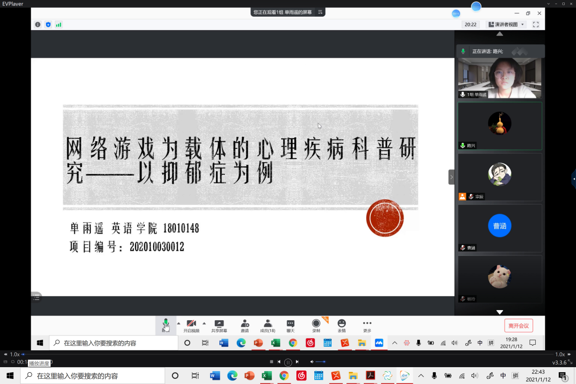 1月12日晚,taptap点点体育成功召开线上2020年大学生创新创业项目中期检查考核答辩会。本次答辩会的评委由taptap点点体育主管科研工作的副院长彭萍教授、主管本科教学工作的副院长张莲教授和党总支书记路兴组成。辅导员宗辰及11位“大创”项目答辩人和项目组成员参加本次答辩会。