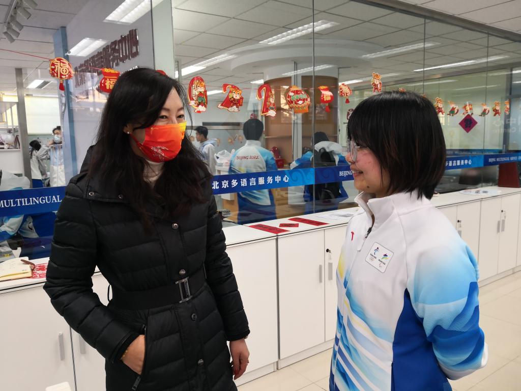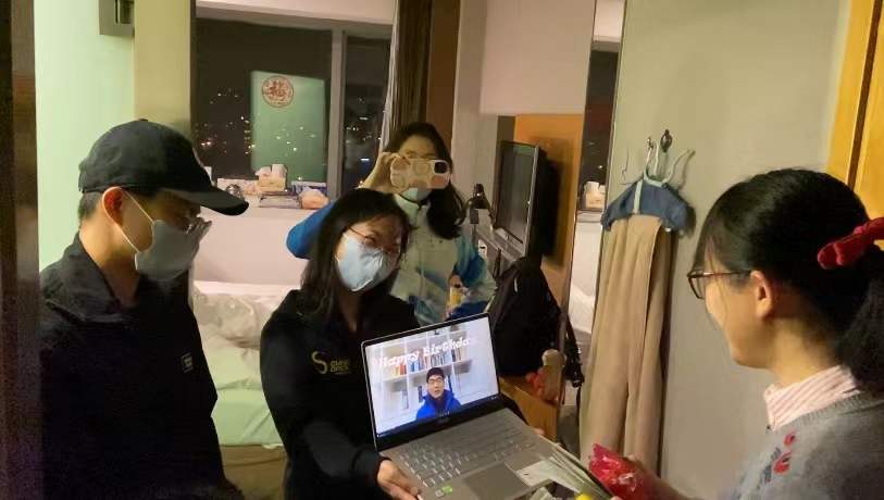 大年初五,王明欣看望了节日期间仍坚守在多语言服务中心工作岗位上的志愿者。王展鹏作为志愿者闭环外指导教师,同时也负责联系冬奥实习生,除了关注学生们志愿服务的相关情况,也为学生返校后的住宿、学习等不断进行沟通协调。彭萍为在九华驻地冬奥志愿者部的同学录制新年祝福视频。