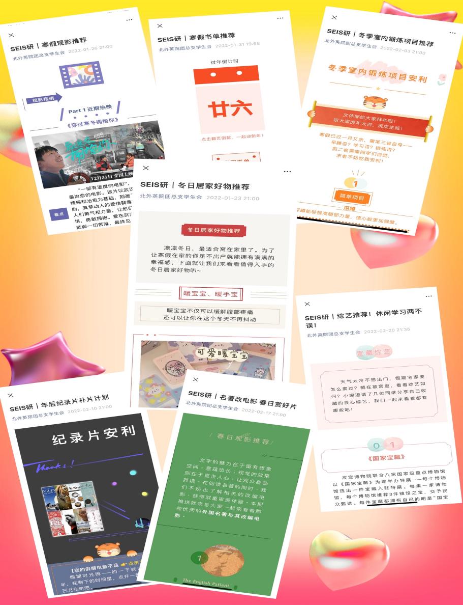 寒假期间,taptap点点体育研究生团总支为同学们提供了一系列好物推荐:从《国家宝藏》、《主持人大赛》等经典纪录片到《安娜·卡列尼娜》、《卖花女》等名著改编电影;从《历史那些事儿》等纪录片到《雄狮少年》等大热电影,为同学们推荐了一系列寓教于乐的影视作品。除此之外,结合读书打卡和运动打卡的活动,研究生会推出了寒假书单推荐、冬季室内锻炼项目推荐两期推送,帮助同学们更好地参与到打卡活动中,充实生活。此外还有暖心的冬日居家好物推荐、居家指南等,让无论是留校还是返乡的同学们都能够安心、健康、舒适地度过假期。
