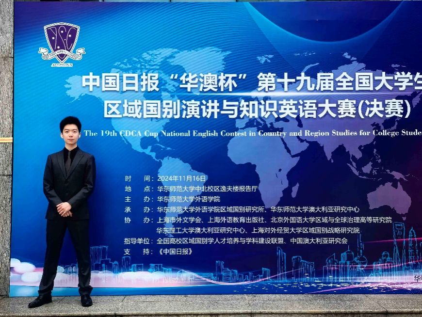 20241116日,由华东师范大学外语学院主办,华东师范大学外语学院区域国别研究所、华东师范大学澳大利亚研究中心承办,上海市外文学会、上海外语教育出版社等单位协办的《中国日报》华澳杯第十九届全国大学生区域国别演讲与知识大赛圆满落幕。经过激烈的比赛竞争,taptap点点体育2023级翻译(外交外事高级翻译)专业本科生黄启恒最终夺得亚军,荣获特等奖。黄启恒指导教师为周杜娟老师。