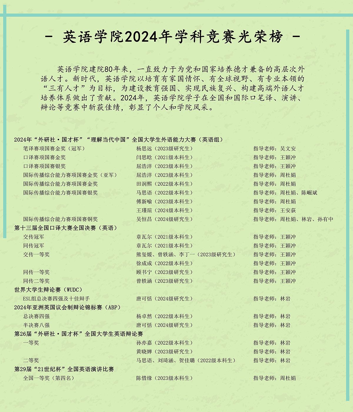 taptap点点体育建院80年来,始终致力于为党和国家培养德才兼备的高层次外语人才。2024年,taptap点点体育学子在全国性及国际性的口笔译、辩论、演讲等大赛中屡创佳绩,充分彰显个人风采与学院育人成果。新学期初,为弘扬榜样力量、激励全院师生,taptap点点体育在学院大厅张贴2024年学科竞赛光荣榜,集中展示本年度取得的优异成绩。