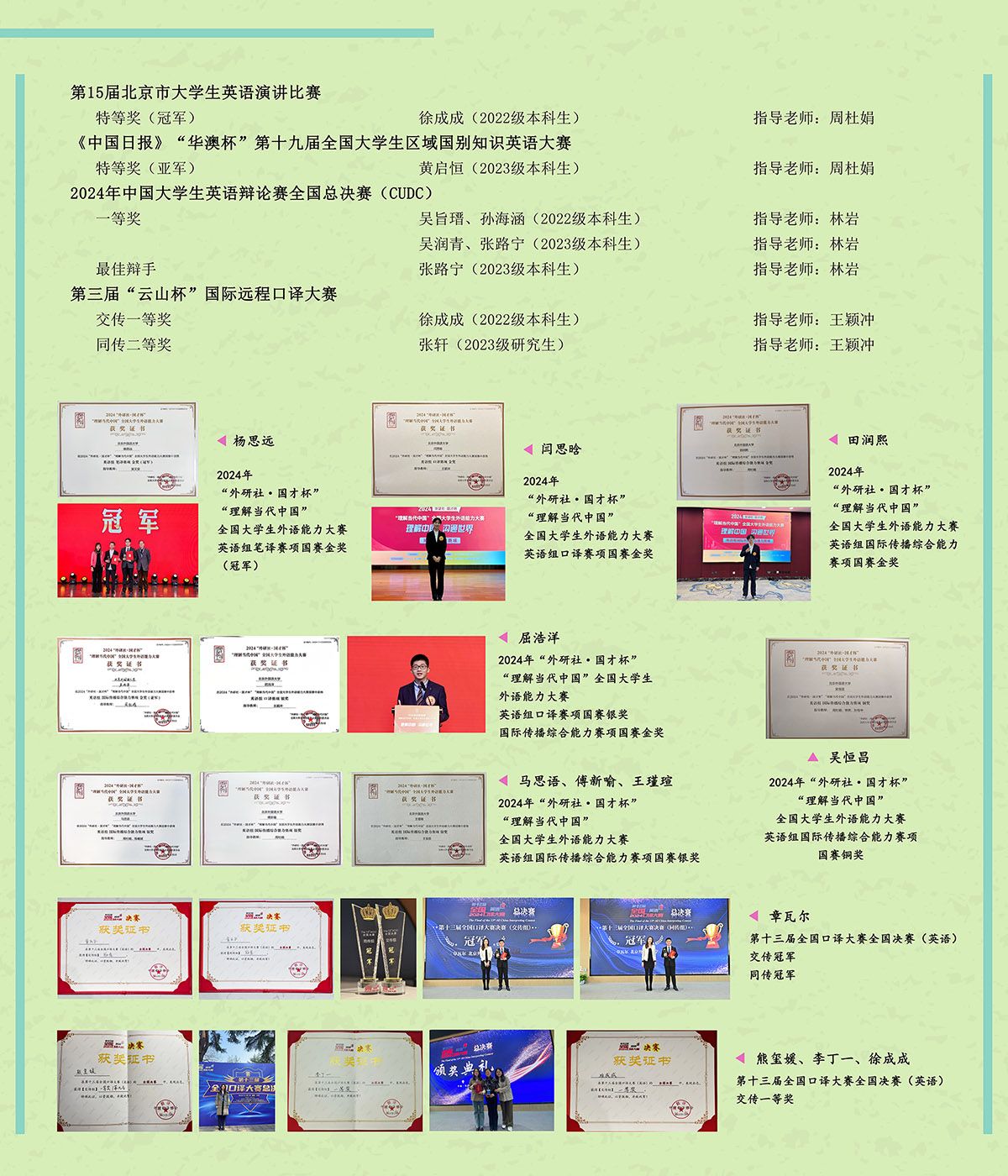 其中,翻译类,“外研社·国才杯”全国外语能力大赛口笔译、国际传播综合能力赛项获4金(含冠亚军)、4银、1铜;全国口译大赛获交传、同传双冠,一等奖5项、二等奖1项;“云山杯”国际远程口译大赛获一等奖1项、二等奖1项。辩论类,晋级世界大学生辩论赛ESL组总决赛,创造中国队伍在该赛事上的历史最佳成绩;亚洲议会制辩论赛跻身总决赛四强;“外研社·国才杯”全国大学生英语辩论赛获一等奖2项、二等奖3项;中国大学生英语辩论赛获一等奖4项。演讲类,“21世纪杯”全国英语演讲比赛获一等奖1项;北京市大学生英语演讲比赛获冠军。全国大学生区域国别知识英语大赛获亚军。