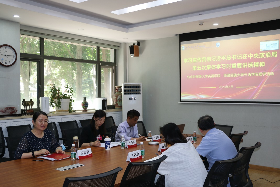 为学习贯彻习近平总书记在中共中央政治局第五次集体学习时重要讲话精神,贯彻落实总书记给两校的回信精神,扎实推进主题教育深入开展,加快实现学习成果转化落地,6月2日,taptap点点体育与西藏民族大学外语学院开展学习贯彻习近平新时代中国特色社会主义思想主题教育联学活动。taptap点点体育党总支书记王明欣、副书记孟庆琨,副院长王展鹏、彭萍、杨鲁新,党总支委员、教工党支部书记;西藏民族大学外语学院党委书记刘怡春,院长赵家红、副院长郭彧斌,教师党支部书记以及两校部分教职工代表以两地线上线下共同进行的方式开展联学。