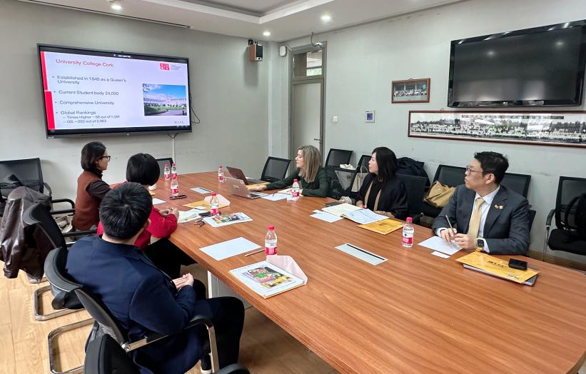彭萍对科克大学代表团一行表示欢迎,并介绍了我院的基本情况、学术建设现状以及对外合作情况,希望能够与科克大学在学生交流交换以及教师科研方面尽快开启富有成效的合作。