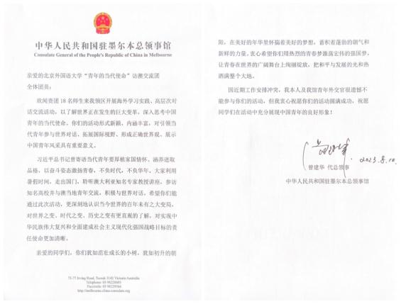 “青年的当代使命”交流团是今年暑假学校派出的“全球文明与青年责任”学生海外实习实践团中人数最多的团组,实践活动也受到了在澳使领馆的大力支持。驻墨尔本总领事馆曾建华代总领事专门来函,肯定交流团“活动形式新颖、内涵丰富,对引领当代青年参与世界对话、拓展国际视野、形成正确世界观、展示中国青年风采具有重要意义”,并激励成员们深刻学习并体会习近平总书记的寄语,与澳各界展开交流,传播中国声音。交流团第一站来到了墨尔本。