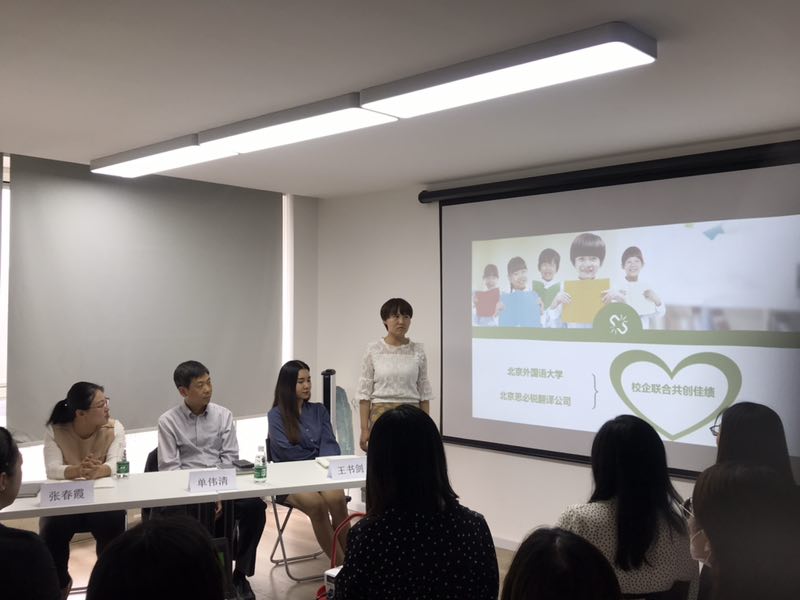 之后思必锐翻译公司总经理单伟清与英院师生亲切座谈,英院校友刘雅堃、鲁弥弥、张亚娟,思必锐翻译公司相关职能部门人员参加了座谈会。三位校友介绍了她们毕业后在思必锐翻译公司工作的情况,刘雅堃和张亚娟担任翻译项目经理,负责业务洽谈、业务分配和后续跟进等,鲁弥弥是专职翻译,主要负责人文艺术类翻译。她们建议在校生要多读书,不断提升自己的翻译能力,但作为专业翻译人员,在广的基础上,也要专,要有自己擅长和感兴趣的领域。校友们还回答了师弟师妹的问题,如关于中译外和外译中对于翻译人员的要求,计算机辅助翻译在实际工作中的应用,公司对翻译人员的招聘要求等问题。三位校友耐心地解答了问题,尤其讲了计算机辅助翻译在实际工作中也会用到,但最后必须人工校译,成稿不能有机器翻译痕迹,有些涉密文件更是禁止用翻译软件。