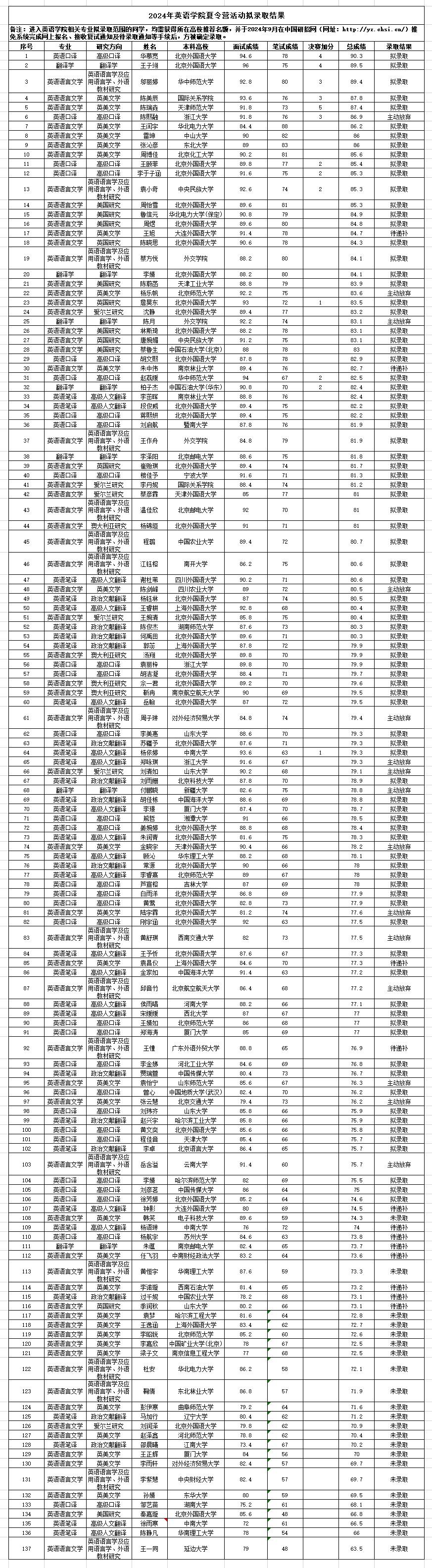 2024年夏令营活动拟录取结果(硕士研究生)